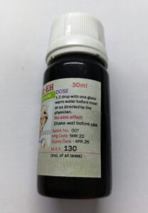 DOSE- 1-2 DROPS WITH ONE GLASS WARM WATER BEFORE MEAL OR AS DIRECTED BY THE EH PHYSICIAN.
