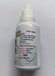 DOSE- 10-15 DROPS WITH HALF CUP WARM WATER AFTER MEAL OR AS DIRECTED BY THE EH PHYSICIAN.